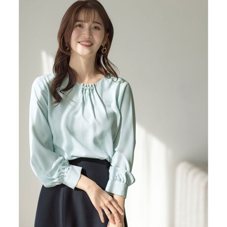 ・襟元タックの間にパール調モチーフを施したデザイン・顔回りが華やぐ上品見えブラウス