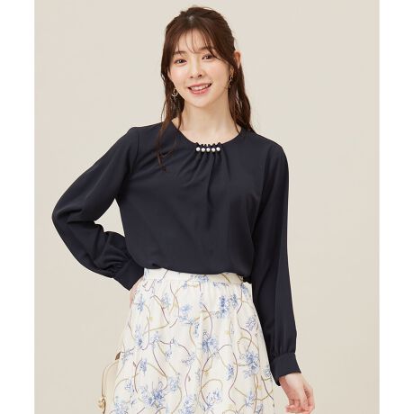 ・襟元タックの間にパール調モチーフを施したデザイン・顔回りが華やぐ上品見えブラウス