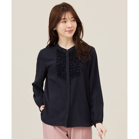 ・フロントのフリルデザインが華やかな印象・第一ボタンのみ薄い金色でポイントに(その下からは比翼ボタン開き)・通勤などきれいめシーンにも着用可能