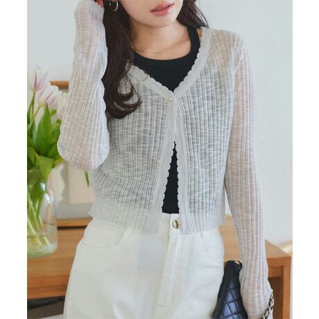 程よく透け感のあるシアーなリブニット素材で涼し気ながらもフェミニンな印象に。