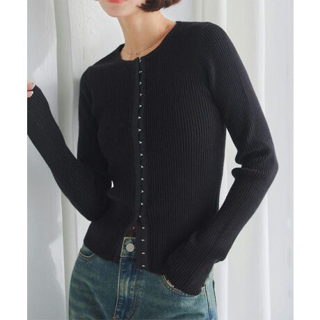 フロントのホックボタンが特徴的なトレンドトップス。ホックの留め方で印象を変えられ