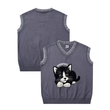 キュートな猫のイラストが目を引く、遊び心満載のニットベスト。