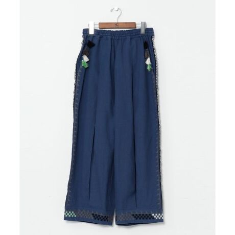ボリュームのあるバレルシルエットが新鮮なパンツ。 ウズベキスタンの民族衣装、チャパンからインスピレーションを受けデザイン。センターの幅広タックがスタイルよく見せます。ポケットのタッセル、チャパンで使われるモチーフの刺しゅうでゴージャスな印象に。 素材は織機にこだわり、素朴なスラブコットン織りを使用。