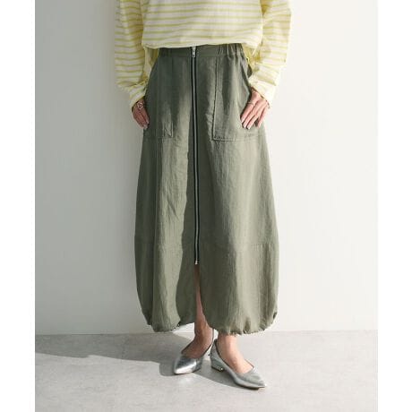 やや光沢感のある滑らかな手触りの素材で仕立てたデザインスカート。スタンダードにはもちろん、裾のドローコードを絞ってフェミニンなコクーンシルエットにもアレンジが効く汎用性の高さも魅力です。フロントジップがエッジの効いたアクセントをプラス。気分に合わせてマルチなスタイリングを楽しめるおすすめのアイテムです。透け感[なし]