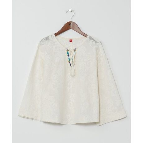 [型番:ILL-5113-2025]ウズベキスタンを彷彿とさせる、アラベスク柄のコットンレースを使用したレディーストップス。透け感のあるレース素材が印象的。すっきりとしたシルエットで、ネックラインにはアラベスク建築のモチーフを刺しゅうしました。