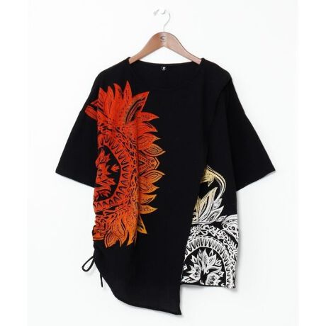 [型番:IAC-5159-2025]素肌に心地いい、表面感のある素材の変形メンズトップ。対角線上に描かれたグラデーションのトライバル柄が印象的。アシンメトリーな前開きのデザインがストレスフリーな着心地を演出。サイドのストリングでシルエットを変えて楽しめる一枚。