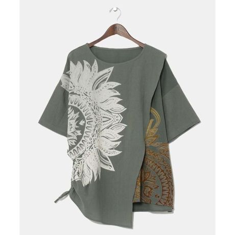 素肌に心地いい、表面感のある素材の変形メンズトップ。対角線上に描かれたグラデーションのトライバル柄が印象的。アシンメトリーな前開きのデザインがストレスフリーな着心地を演出。サイドのストリングでシルエットを変えて楽しめる一枚。