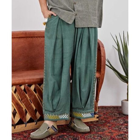 ボリュームのあるバレルシルエットが新鮮なメンズパンツ。 ウズベキスタンの民族衣装、チャパンからインスピレーションを受けデザイン。センターの幅広タックがスタイルよく見せます。ポケットのタッセル、チャパンで使われるモチーフの刺しゅうでゴージャスな印象に。 素材は織機にこだわり、素朴なスラブコットン織りを使用。