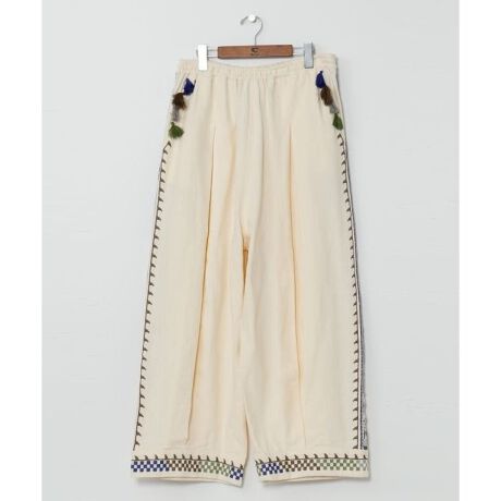 ボリュームのあるバレルシルエットが新鮮なメンズパンツ。 ウズベキスタンの民族衣装、チャパンからインスピレーションを受けデザイン。センターの幅広タックがスタイルよく見せます。ポケットのタッセル、チャパンで使われるモチーフの刺しゅうでゴージャスな印象に。 素材は織機にこだわり、素朴なスラブコットン織りを使用。