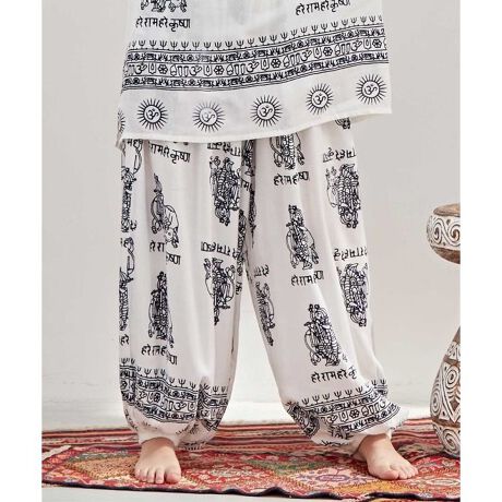 [型番:IDS-5134-2025]「ラムナミ」をモチーフにしたメンズパンツ。「ラムナミ」とはヒンディーの神様や文字が印刷された礼拝用の布のこと。神聖さ、愛、知、美の神であるクリシュナが描かれています。フラットレーヨンで落ち感があり、涼しくラフに着用できる一枚。