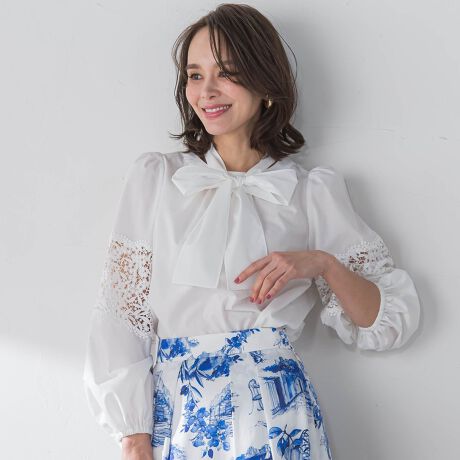 袖にオリジナルの繊細なレースをたたきつけた上品なブラウス。