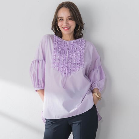 コーディネートを華やかな印象に導く胸元のクチュール感漂うタックディテールがポイント。