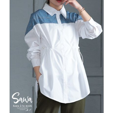 【トップス】 シャツ 羽織り プリント 異素材風 フェイク デニム風 長袖 配色 襟 ホワイト 白