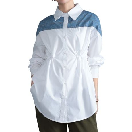 デニムをドッキングしたようなプリントが今っぽさ漂うシンプルなシャツトップス。ヴィンテージ感のあるデニム風プリントが小粋なデザイン。デニムプリントのステッチラインには、アルファベットが並び、細部まで遊び心ある拘りを感じさせてくれる一枚。きちんと感漂うレギュラーカラーでオフィスなどにも馴染みやすく、フルオープンできる前立てだから、さっと羽織るだけでもサマになります。ウエスト部分にはドロストを採用し、絞ることでメリハリあるシルエット&脚長効果にも。清潔感のあるホワイトカラーで明るい印象を纏い、長めの丈がヒップラインまでしっかりカバー。ラウンドカットされた裾のラインで、アウトコーデ時にも柔らかな印象をプラスします。カジュアルから綺麗めまで幅広くマッチし、オンにもオフにも馴染むトレンド感ある一枚。