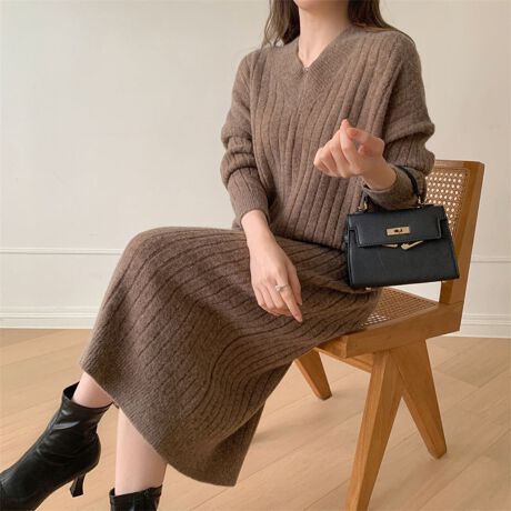 大人の魅力を引き立てるVネックリブニットワンピースです。<br>