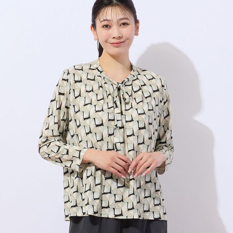 モダンな幾何柄をプリントしたトップスは、ボウタイが上品な一枚。