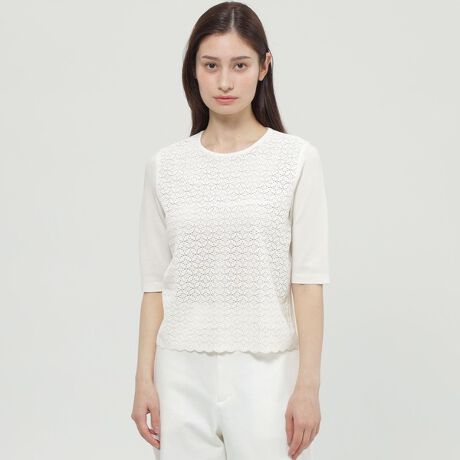 前身頃には上品かつ華やかなケミカルレースを施しつつ、後身頃はストレッチ性の効いた着心地の良いニットをドッキングしたプルオーバーです。