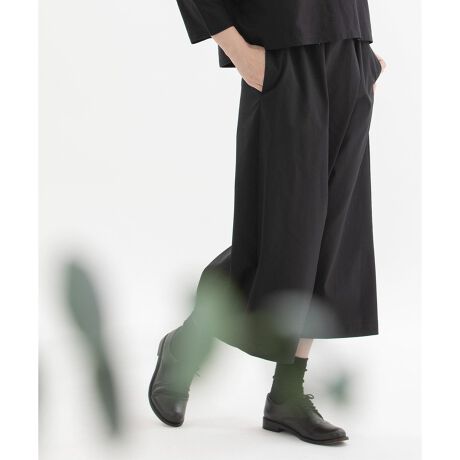 モード感漂う大人かっこいいパンツ。すっきりしたスカート見えする前後ラップのデザインです。ウエストはゴム仕様、両サイドにはスカラップステッチ入りのポケットつき。