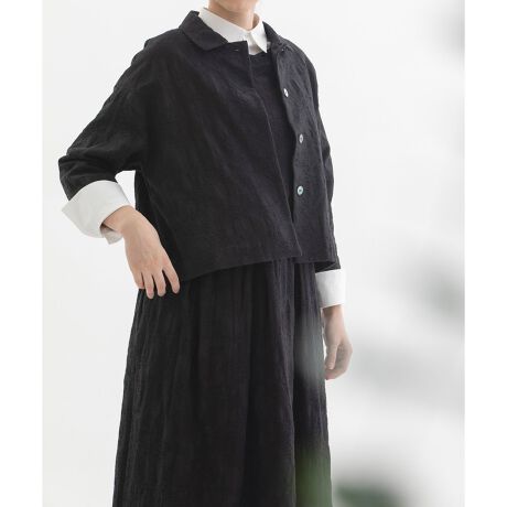凹凸感のあるコットンリネンのジャカードで仕立てた、きちんと見えする軽いジャケット。ワンピースにも相性のいいショート丈、お袖は7分袖でバランスの良いシルエットです。両サイドポケットつき。