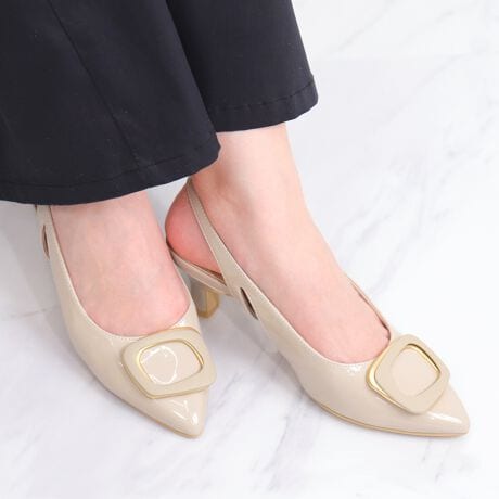 ・大人っぽい輝きのマットゴールドと、本体と同色のバックルを重ねたモチーフがポイントのバックベルトパンプス。