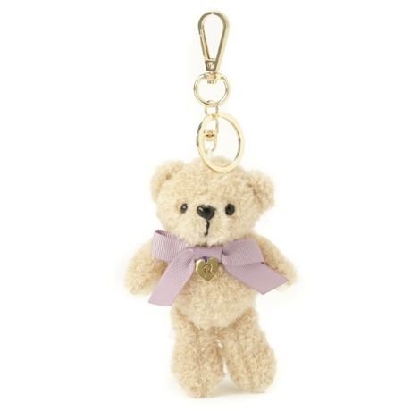 首元のハート型のイニシャルプレートとカラーリボンをあしらった、かわいらしいクマのマスコットチャームです。