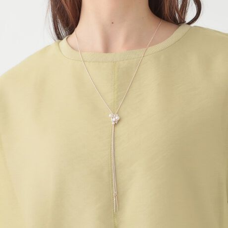 華やぎを添える、フェイクパールとビジューのループタイネックレス