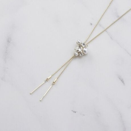 エレガントなフェイクパールとキラキラ輝くビジューを組み合わせたループタイネックレス。