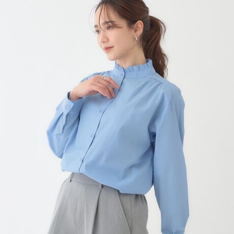 襟先が甘すぎないフリルのスタンドカラーが印象的なブラウス。