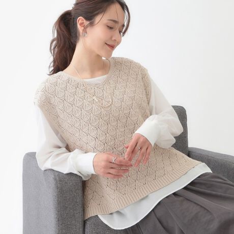 着るだけでレイヤードスタイルが完成する、透かし編みニットベストとブラウスのセットアイテムです。