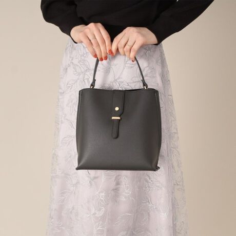 カシメ付きのベルト飾りがポイントの合皮ミニトート。