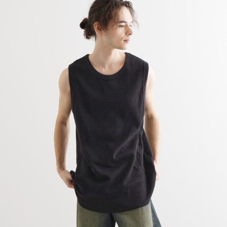 Tシャツやシャツ等のレイヤードに最適な、やや着丈が長めのワッフルノースリーブタンク。