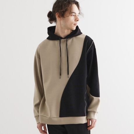 異素材使いで表現したカーブ切り替えがポイントのパーカ。