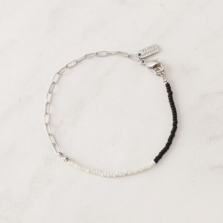 ビーズとケーブルチェーンをハーフで組み合わせた洗練されたデザインは、シャツやTシャツに合わせてさり気なく魅力を引き立てます。