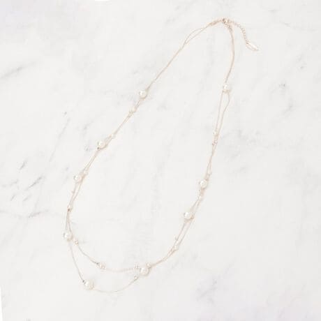 大小のフェイクパールが絶妙に配置された2連デザインが特徴のネックレス。