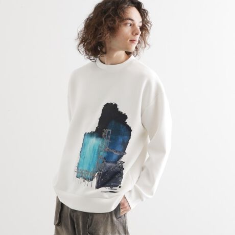 アブストラクト柄をプリントと刺繍で表現し、フロント裾に配した一枚。