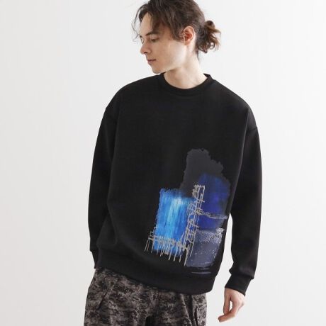 アブストラクト柄をプリントと刺繍で表現し、フロント裾に配した一枚。