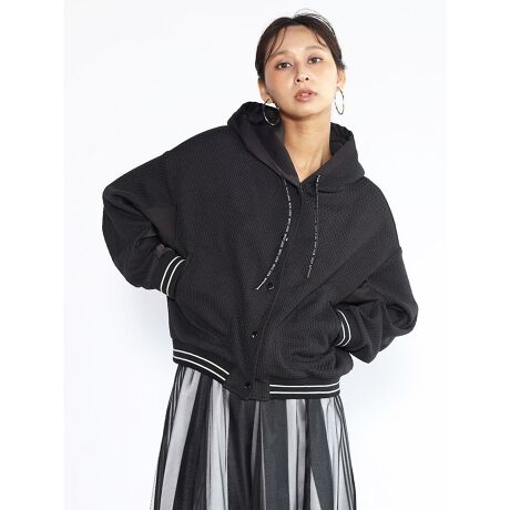 ニット×サテンの異素材切り替えがユニークなフーデッドブルゾン。