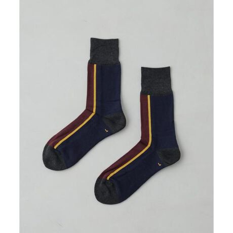 サイドとフロントから見たときで表情が変わるよう配色したセンターラインソックス。長めのリブが締め付けはソフトながらずれ落ちにくいテンションで、ストレスのない履き心地です。