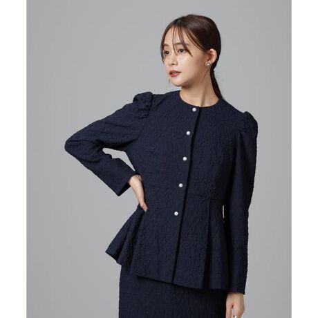 表面感のあるふくれジャガードが上品で、ブラウスのような感覚のジャケット。ハイウエスト切り替えのフレアなシルエットがスタイルアップな着こなしを叶えます。
