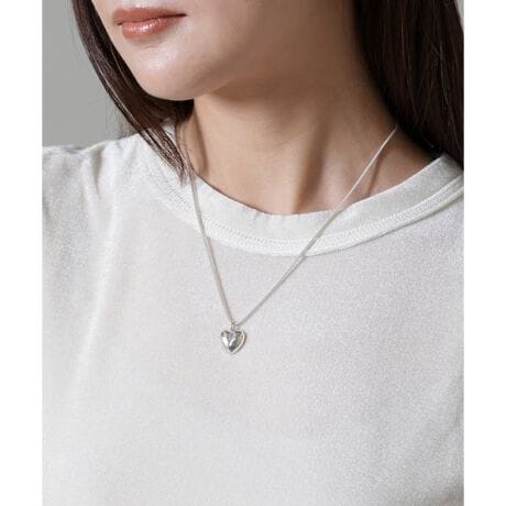 絶妙なサイズ感のハートモチーフがポイントのネックレス。シンプルなTシャツやワンピースに合わせるだけで、存在感のあるシルバーカラーがクールな印象に。チョーカーやお手持ちのアクセサリーとの重ね付けもおすすめ◎ご自身用には勿論、さりげない遊び心を感じさせるデザインがギフトにも喜ばれるアイテムです。