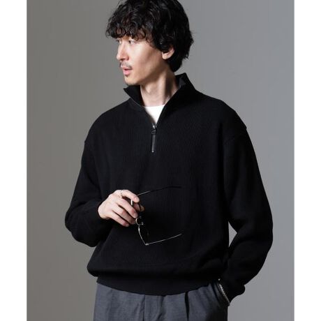 ハーフジップデザインに、ドライバーズニットをミックスさせたようなディティールがポイントの別注ニット。スッキリとしたシルエットで上からジャケット等を羽織ることも可能。上品な印象で大人カジュアルスタイルに活躍する1着です。
