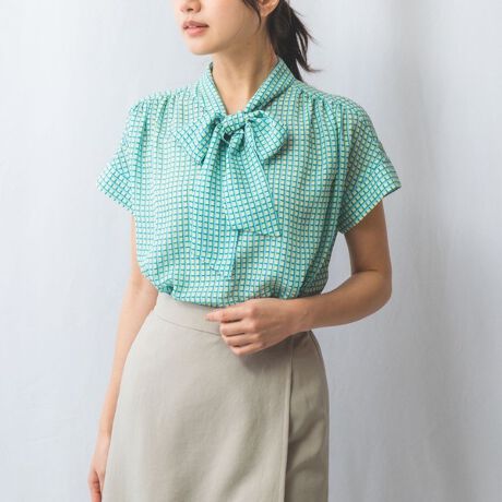 フレッシュな初夏のカラーで展開された幾何学チェック柄が魅力的なブラウス。首元にはボウタイをあしらっており、コーディネートのアクセントとして活躍します。ゆったりとしたシルエットと、程よく落ち感のある袖丈がポイント。背面の首元にはファスナーが付いているため、着脱もスムーズに行えます。シンプルな無地のボトムスと合わせて、トップスを主役にしたスタイリングがおすすめです。