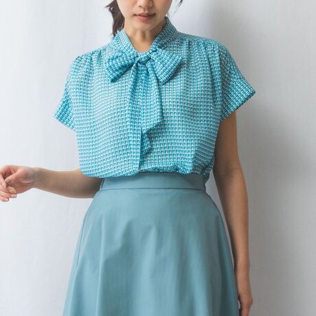 フレッシュな初夏のカラーで展開された幾何学チェック柄が魅力的なブラウス。首元にはボウタイをあしらっており、コーディネートのアクセントとして活躍します。ゆったりとしたシルエットと、程よく落ち感のある袖丈がポイント。背面の首元にはファスナーが付いているため、着脱もスムーズに行えます。シンプルな無地のボトムスと合わせて、トップスを主役にしたスタイリングがおすすめです。