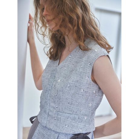 爽やかなリネンライクの生地感と、エアリーで軽やかなビジューやチュールディティールが春夏のスタイルにマッチする一着です。