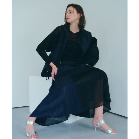 ピンストライプ、サテン、シフォンのシアー素材を組み合わせたパッチワーク風デザインのスカート。