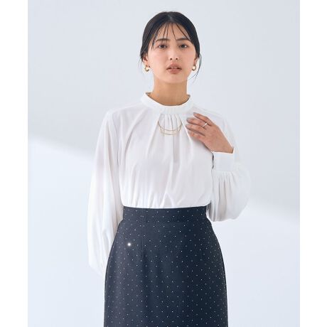 フロントのピンタックとアクセサリーがポイントの華やかなブラウス。上品に煌めくメタルパーツは取り外し可能な2WAYデザインです。シンプルなワンカラーでコーディネートに取り入れやすく、ジャケットのインナーアイテムとしても最適。春のセレモニーシーンやオフィススタイルにも活躍してくれるおすすめの一枚です。