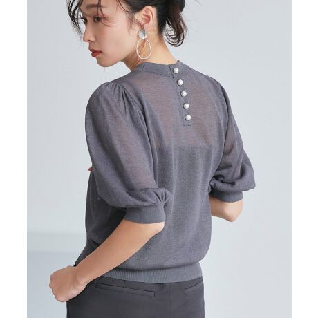 肩の柔らかく繊細なギャザーと後ろのパールポイントが女性らしいサマーニット