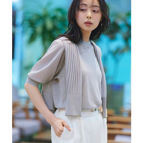 肩の柔らかく繊細なギャザーと後ろのパールポイントが女性らしいサマーニット