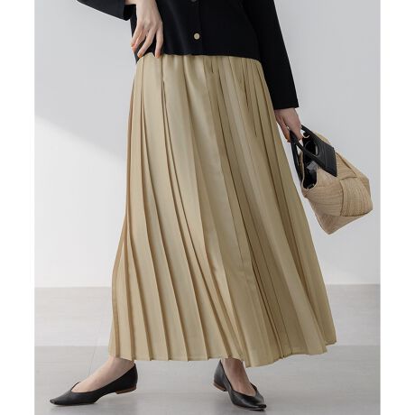 細幅プリーツと太幅プリーツの前後で違う表情が楽しめるマルチウェイプリーツスカート。2面のプリーツを組み合わせることで、ドラマッチックな印象をつけています。気分に合わせて前後を変えたり、切替部分をフロントにして左右アシメデザインとしてもお召しいただけます。すとんと落ちる広がりすぎないシルエットで着膨れせず大人かわいい一枚。ウエストはゴム仕様で着脱もしやすいデザインです。カラーは、柔らかく馴染むベージュ(#033)、お洒落なカーキ(#054)、ニュアンス感のあるセージ(#062)の3色展開です。