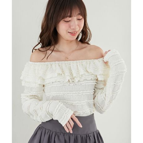 たっぷりのフリルがフェミニンな印象を引き立て、広めに開いた首周りが顔周りをすっきりと見せてくれます。